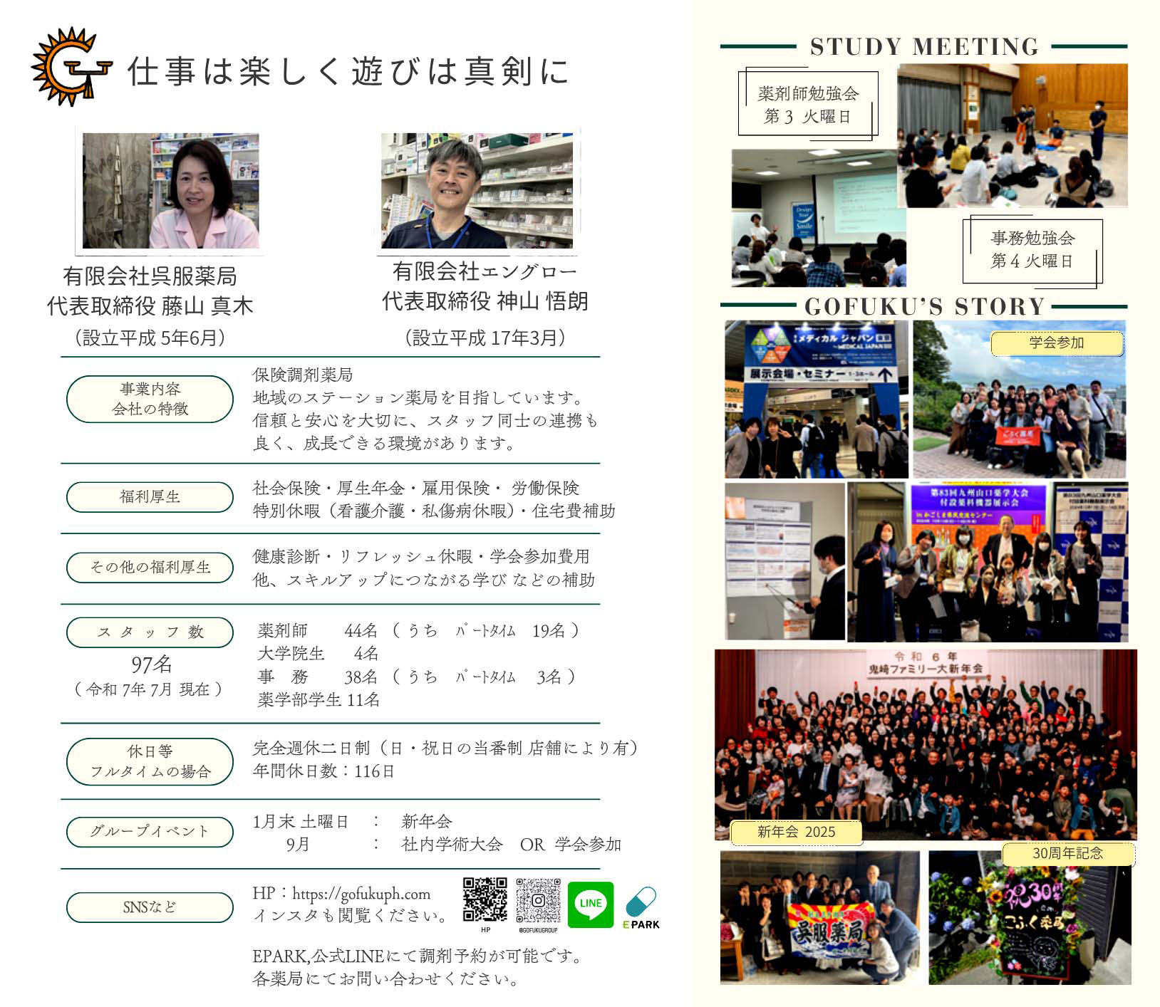 「ごふく薬局グループ」は地域の皆さまに愛されるステーション薬局を目指します。「仕事は楽しく、遊びは真剣に!」をモットーに、患者様の健康を守ることはもちろん、地域社会へも貢献できるような薬局作りに励んでいます。